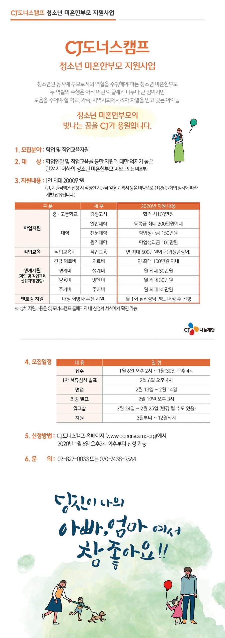 상세한 지원 및 신청내용은 CJ나눔재단 청소년 미혼한부모 지원사업