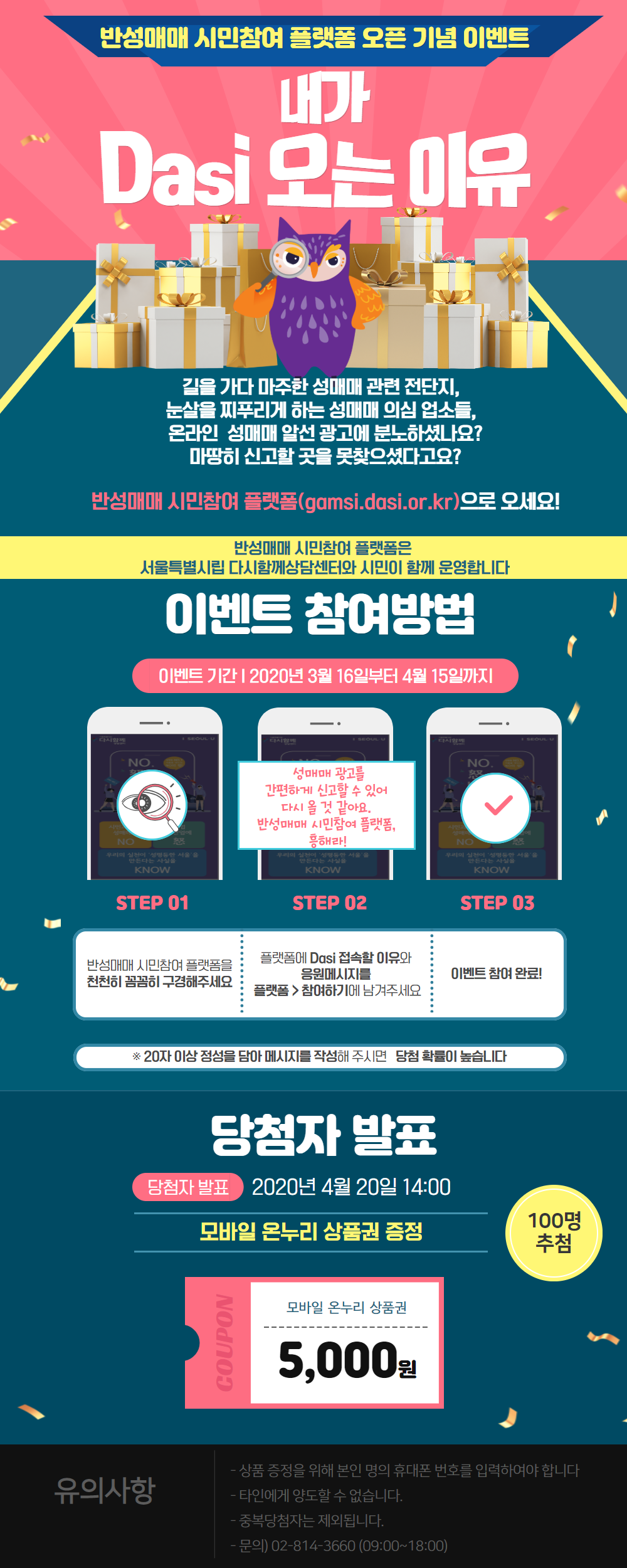 서울특별시림 다시함께상담센터와 시민이 함께 운영하는 반성매매 시민참여 플랫폼의 오픈 이벤트에 많은 참여 부탁드립니다.