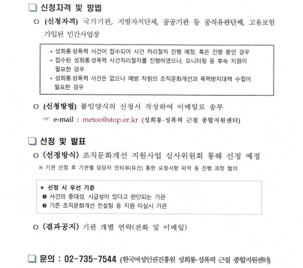2020년「직장 내 성희롱·성폭력 근절을 위한 조직문화개선 지원사업」을 다음과 같이 실시하고자 합니다.