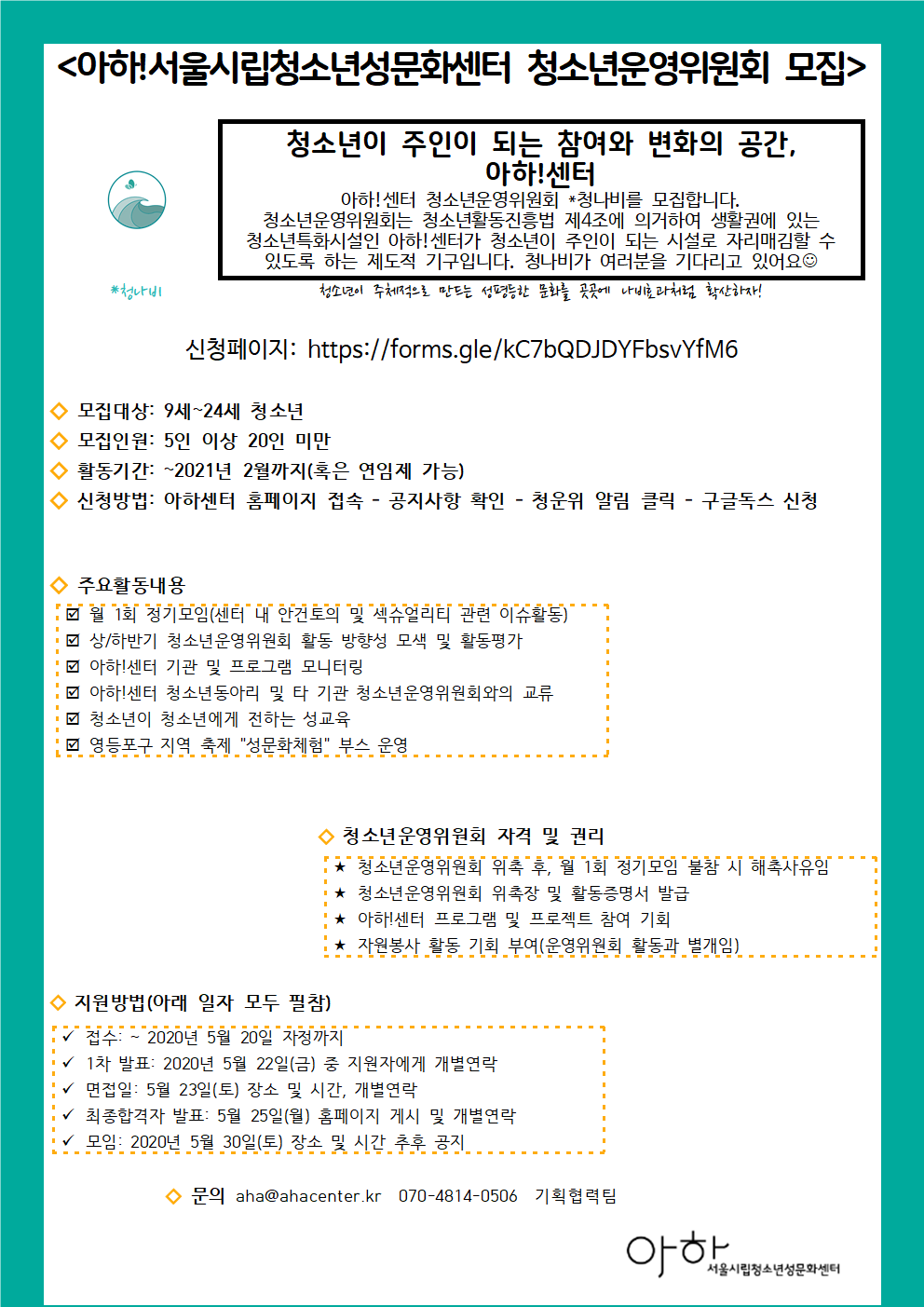2020년 아하!센터와 함께할 청소년운영위원회 ‘청나비’를 모집합니다.