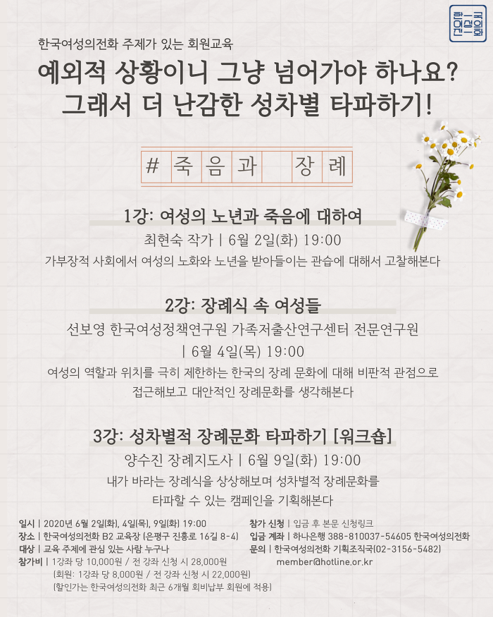 이번 주제가 있는 회원교육에서는 이런 질문과 여러 답들을 함께 공유해보고자 합니다. 여성의 ‘나이 듦’에 대한 한국 사회에서의 고정관념을 살펴보고 여성의 노년과 죽음을 다르게 사고해볼 수 있는 시간을 가지려고 합니다. 또한 여성의 역할과 위치를 제한하는 한국의 장례 문화를 비판해보고 내가 원하는 장례식, 성평등한 장례식을 상상해보고자 합니다.