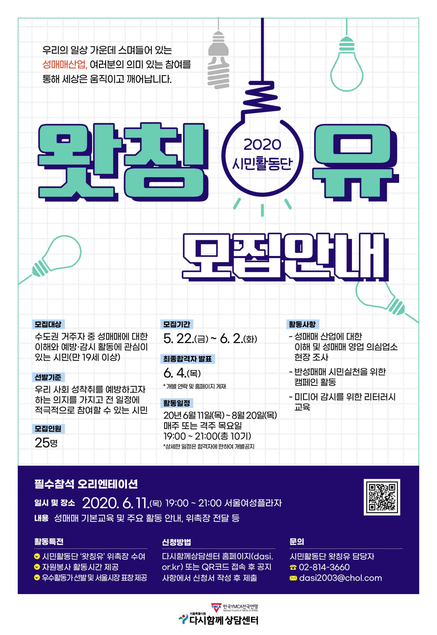 ☞ 모집대상: 수도권 거주자 중 성매매에 대한 이해와 예방 및 감시 활동에 관심이 있는 만 19세 이상의 시민