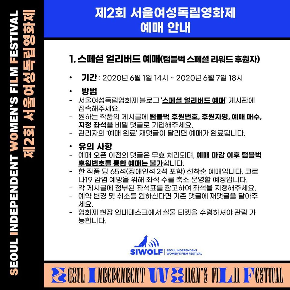 제2회 서울여성독립영화제 예매 일정과 방법을 공지합니다. 자신에게 맞는 예매 유형을 확인하신 후 예매 일정과 방법을 숙지해주세요. 서울여성독립영화제 블로그에도 각 예매 유형 별 공지가 업로드되어 있으니 참고해주세요.