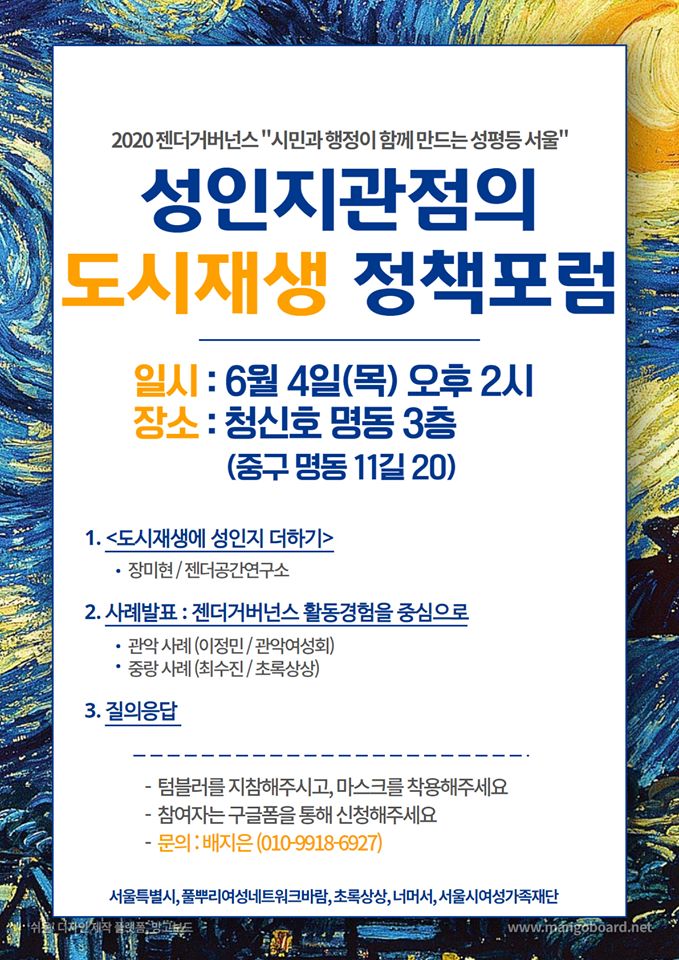 올해 젠더거버넌스 과제로 도시재생을 선정하여 활동할 예정인 분들, 도시재생을 성인지 관점으로 보는 것에 대해 궁금한 분들 참석해주세요!