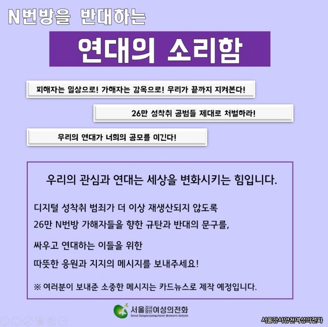 서울강서양천여성의전화에서는 N번방을 반대하는 연대의 소리함 캠페인을 진행하려고 합니다.
