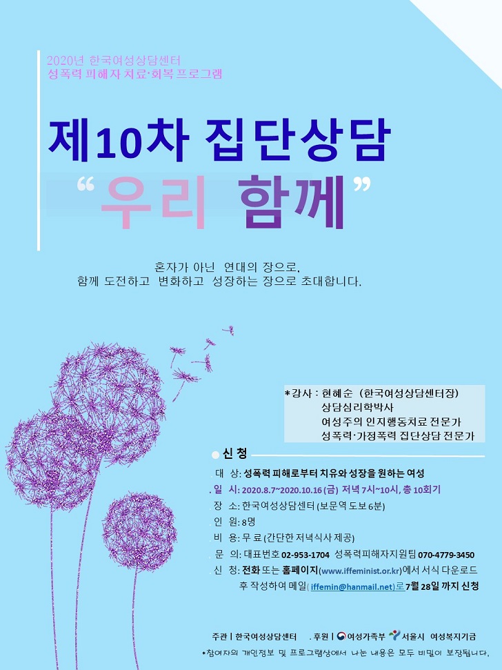 [한국여성상담센터] 제10차 성폭력 피해자 집단상담 <우리 함께> 참여자 모집 (~7/28)