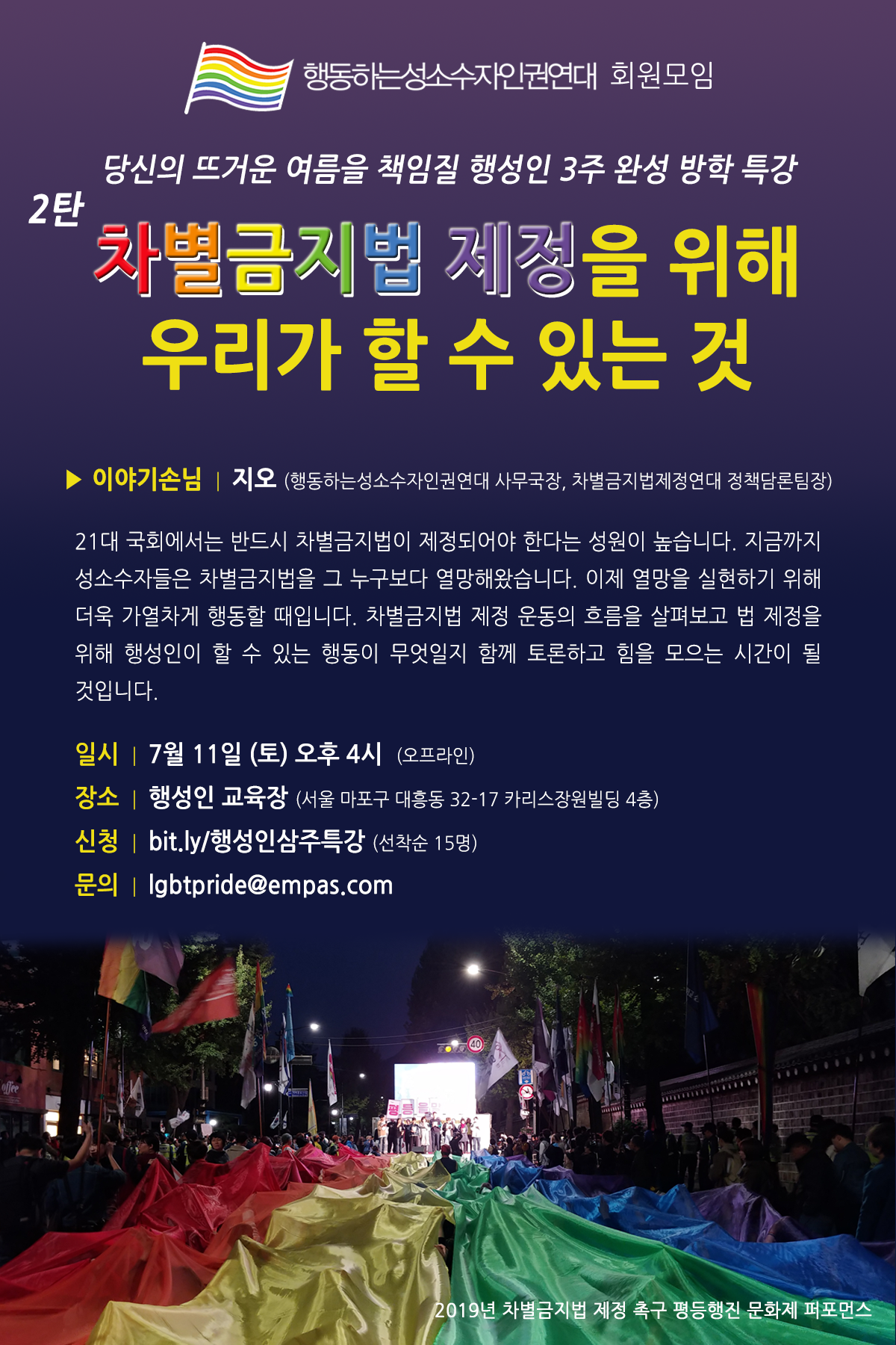 21대 국회에서는 반드시 차별금지법이 제정되어야 한다는 성원이 높습니다. 성소수자들은 차별금지법을 그 누구보다 열망해왔습니다. 이제 열망을 실현하기 위해 더욱 가열차게 행동할 때입니다. 차별금지법 제정 운동의 흐름을 살펴보고 법 제정을 위해 행성인이 할 수 있는 행동이 무엇일지 함께 토론하고 힘을 모으는 시간이 될 것입니다.
