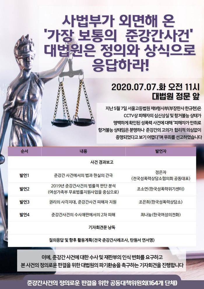 이에 준강간 사건에 대한 수사 및 재판부의 인식변화를 요구하고 본 사건의 정의로운 판결을 위한 대법원의 파기환송을 촉구하는 기자회견을 진행합니다. 여러분의 관심과 참여 부탁드립니다.