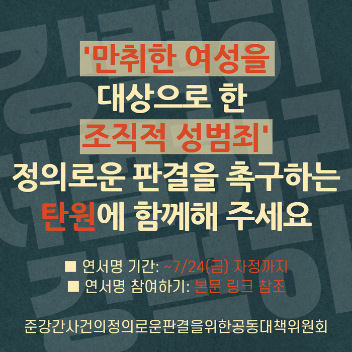 [준강간사건의정의로운판결을위한공대위] ‘만취한 여성을 대상으로 한 조직적 성범죄’ 정의로운 판결촉구 서명에 참여해 주세요. (~7/24)