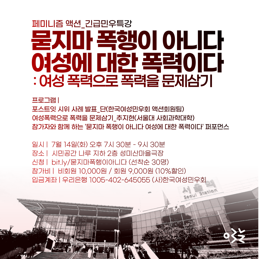[한국여성민우회] 민우특강 <묻지마 폭행이 아니다 여성에 대한 폭력이다> 신청 (선착순 30명)