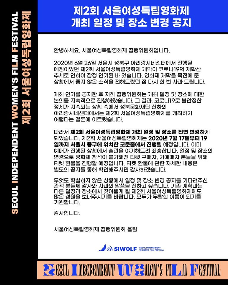 2020년 6월 26일 서울시 성북구 아리랑시네센터에서 진행될 예정이었던 제2회 서울여성독립영화제 개막이 코로나19의 재확산 추세로 인하여 잠정 연기된 바 있습니다. 영화제 개막을 목전에 둔 상황에서 좋지 않은 소식을 전해드렸던 점 다시 한 번 사과 드립니다.