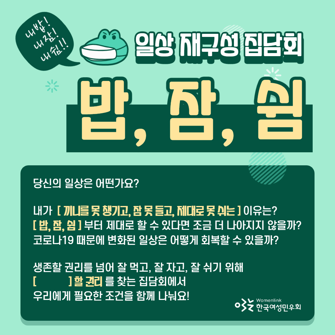 · 장소 : 한국여성민우회 (서울 마포구 월드컵로 26길 39 시민공간 나루 3층)