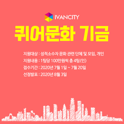 이반시티퀴어문화기금은 한국 최대의 게이 커뮤니티 사이트인 이반시티( http://www.ivancity.com)에서 성적소수자의 문화가 더 발전하고 풍요로워지길 바라며, 작지만 소중한 움직임들을 지원하기 위해 조성된 지원 사업입니다. 지난 2019년 배분에서는 두 번의 배분을 통해 총 9팀에게 900만원의 지원이 진행되었으며, 2020년에도 상하반기로 나누어 총 900만원을 배분할 계획입니다.