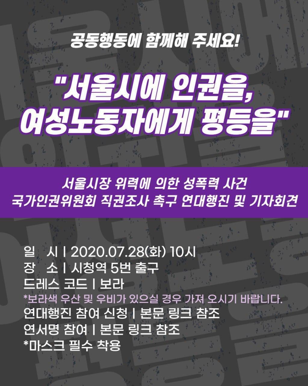 서울시에서 발생한 성추행 성희롱 성차별 문제에 대해 국가인권위원회 진상조사를 촉구하는 공동행동을 진행합니다.