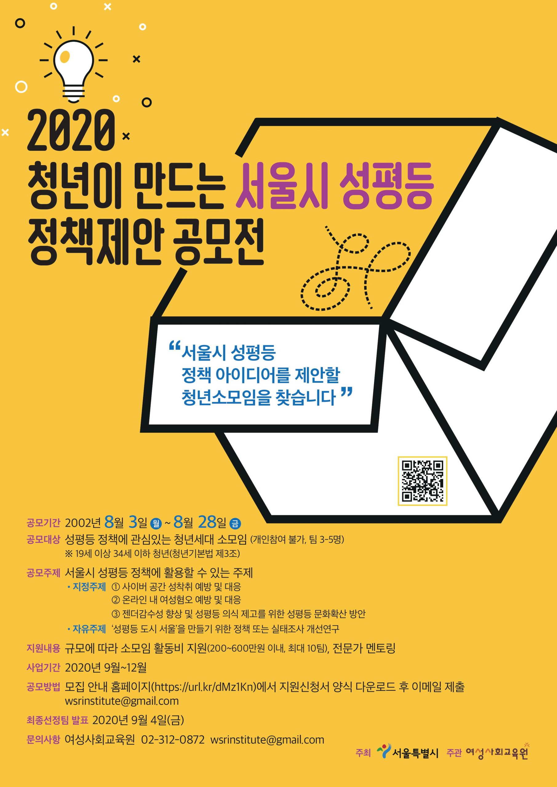 ❍ 심사기준 : 적합성, 창의성, 충실성, 시정반영 가능성 ❍ 결과발표 : 2020.9.4.(금) ※ 서울시성평등활동지원센터 홈페이지 게시 및 선정자 개별 통보 |