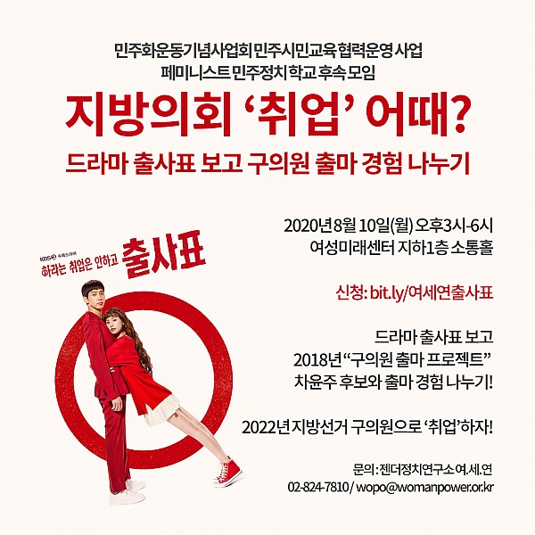 현재 방영 중인 KBS 드라마 〈출사표〉는 ‘민원왕’으로 불리는 29세 청년 여성이 ‘연봉 5천 만원 신의 직장’인 구의원이 되기 위해 무소속으로 출마하여 당선되는 과정과 중년 남성 중심의 의회에서 고군분투 하는 과정 등을 그리고 있습니다. 드라마의 주요 장면을 함께 보고 지방정치의 현실을 짚어보고 페미니스트 정치가 기초의회에도 필요하다는 것을 나누고자 합니다.