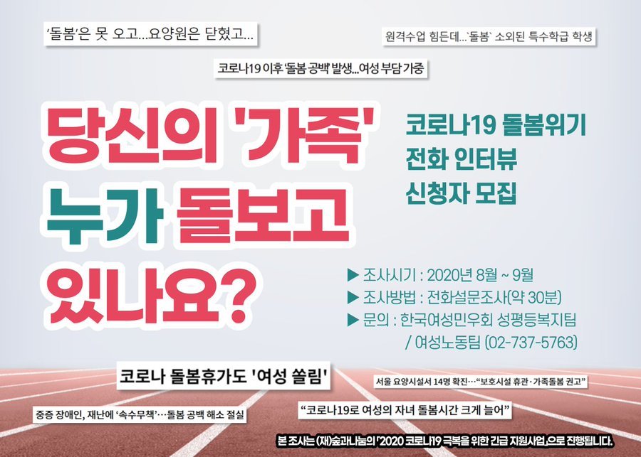 [한국여성민우회] 전화인터뷰이모집 <코로나19 돌봄위기 당신의 '가족', 누가 돌보고 있나요?>
