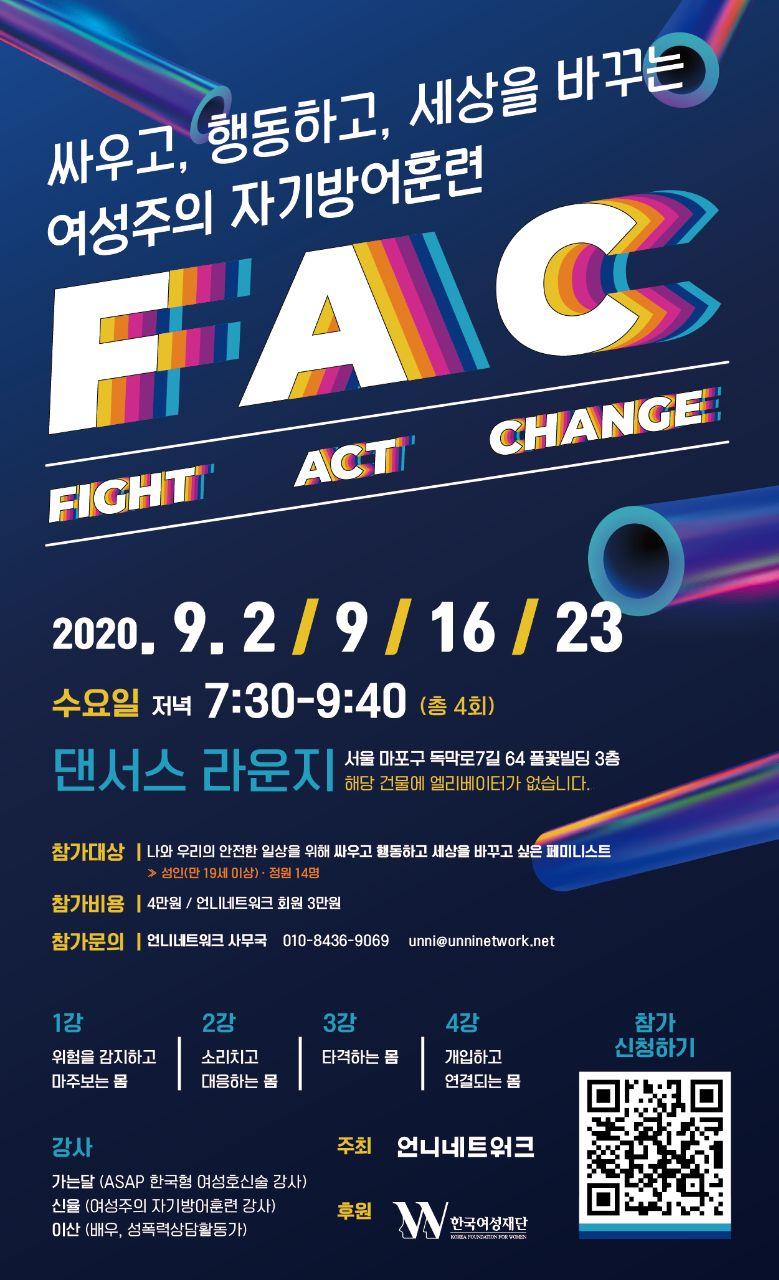 *싸우고, 행동하고, 세상을 바꾸는 여성주의 자기방어훈련 (Fight, Act, Change : FAC) 사업은 한국여성재단의 성평등 사회조성을 위한 지원 기금으로 진행하고 있습니다.