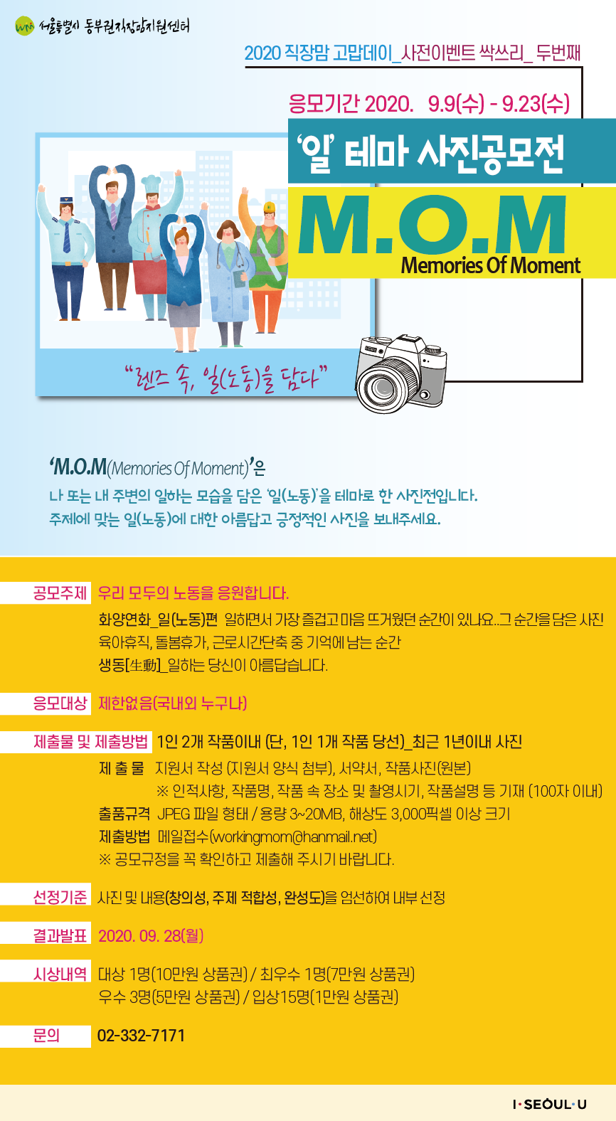 [서울시동부권직장맘지원센터] 2020 직장맘 고맙데이 <'일' 테마 사진 공모전_M.O.M(Memories Of Moment)> (~9/23)