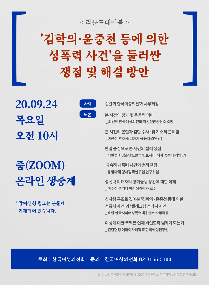 이에 한국여성의전화는 이 사건의 본질은 무엇인지, 이를 둘러싼 법적·시사적 쟁점들을 나누고 사건 해결을 위한 방안을 모색하는 라운드테이블을 개최하고자 합니다. 많은 관심과 참여 바랍니다.