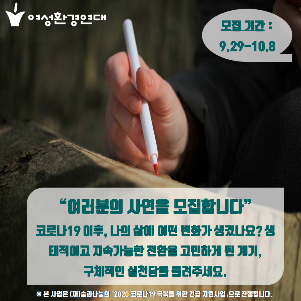 여성환경연대는 코로나19 이후, 생태적이고 지속가능한 전환을 모색하는 개인과 공동체 사연을 모집합니다.