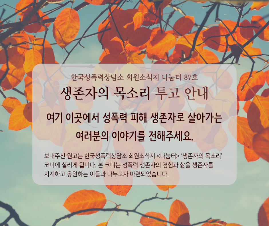 보내주신 원고는 한국성폭력상담소 회원소식지 <나눔터> ‘생존자의 목소리‘ 코너에 실리게 됩니다본 코너는 성폭력 생존자의 경험과 삶을 생존자를 지지하고 응원하는 이들과 나누고자 마련되었습니다.