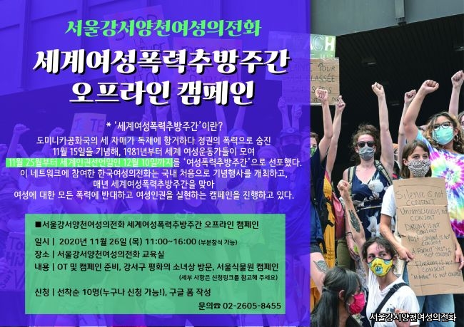 코로나가 다시 극성을 이루는 가운데 건강히 잘 지내고 계신가요? 그럼에도 서울강서양천여성의전화는 올해 세계여성폭력추방주간을 맞이하여 오프라인 캠페인을 진행합니다! 참여가능하신 분들은 신청서 작성해주세요.