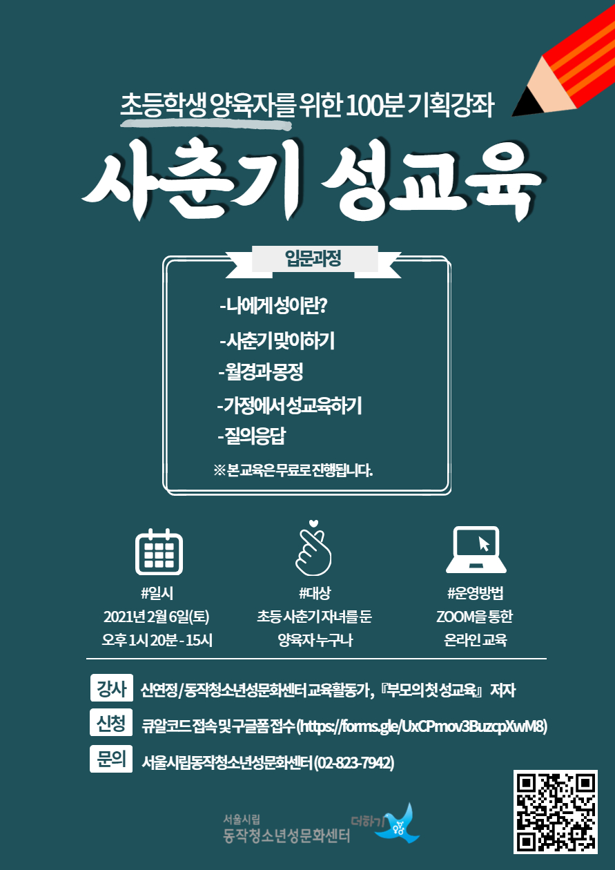 [동작청소년성문화센터] 양육자(유아/초등 사춘기) 성교육 기획강좌 참여자 모집 (1/29, 2/6)