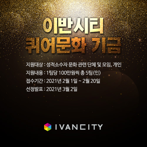 이반시티퀴어문화기금은 한국 최대의 게이 커뮤니티 사이트인 이반시티닷컴http://www.ivancity.com)에서 성적소수자의 문화가 더 발전하고 풍요로워지길 바라며작지만 소중한 움직임들을 지원하기 위해 조성된 지원 사업입니다.