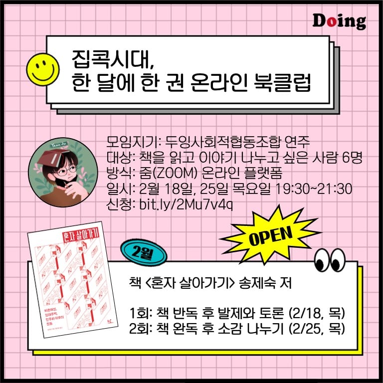 – 대상 : 송제숙 저 <혼자 살아가기> 책을 읽고 얘기하고 싶은 사람 6명
