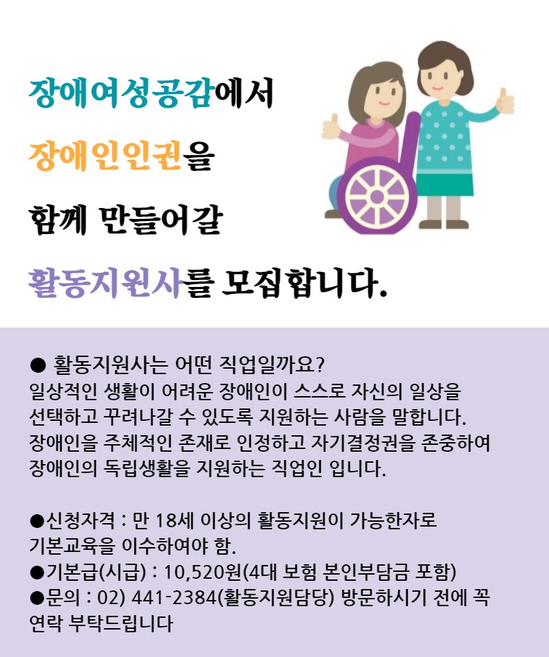 [장애여성공감] 장애인인권을 함께 만들어갈 활동지원사를 모집합니다.