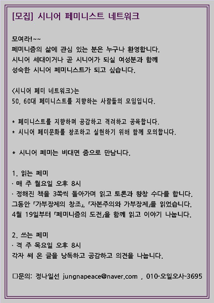 [두잉 사회적협동조합] <시니어 페미니스트 네트워크> 모집