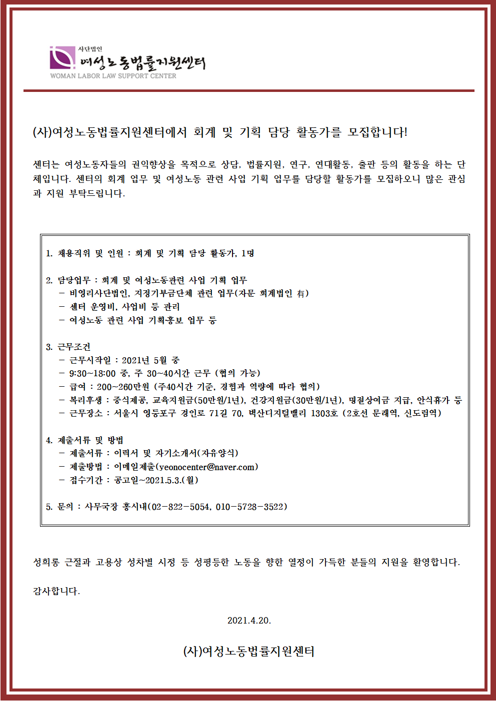 (사)여성노동법률지원센터에서 회계 및 기획 담당 활동가를 모집합니다!