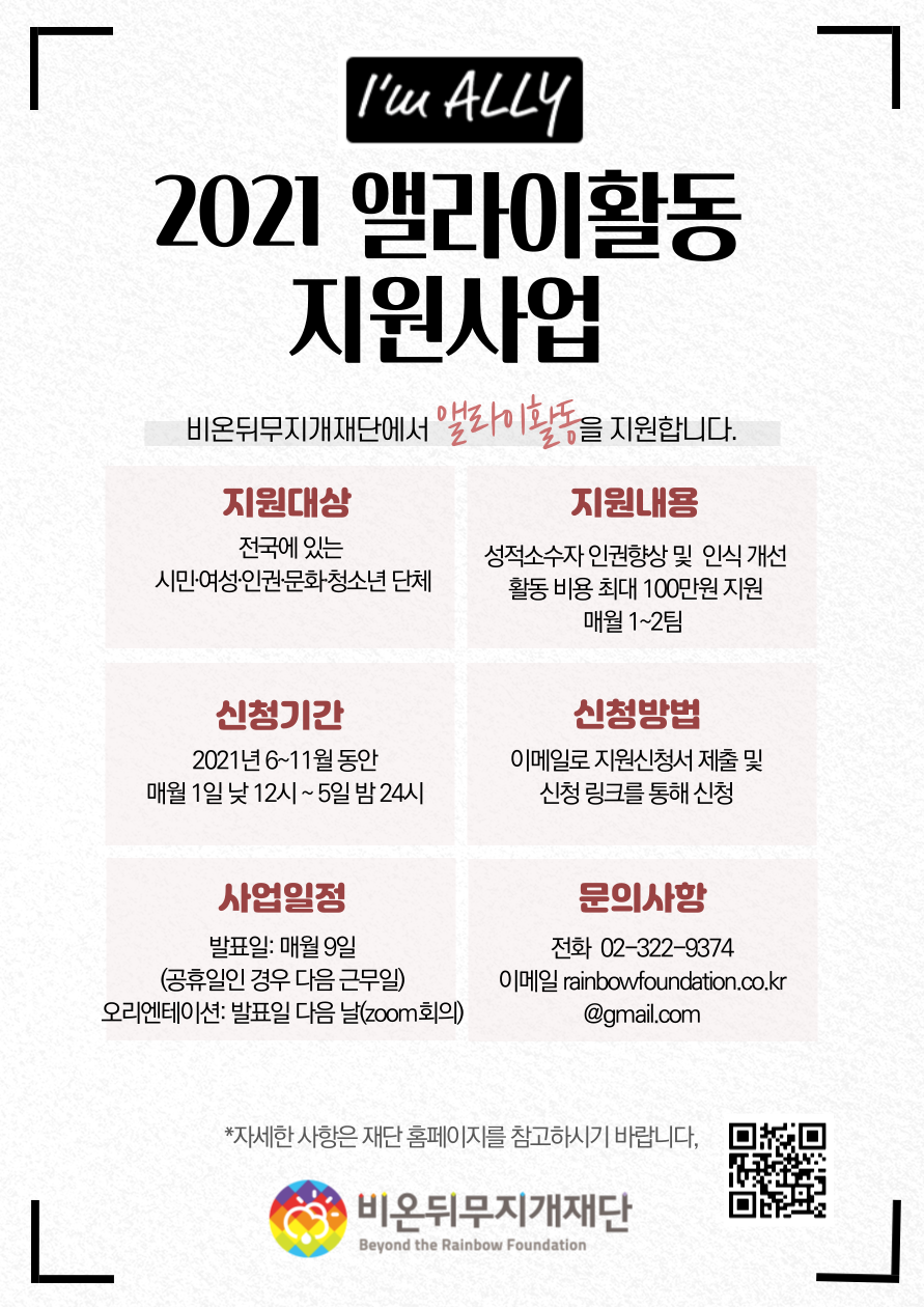 비온뒤무지개재단은 시민⋅여성⋅인권⋅문화⋅청소년 단체의 성적소수자를 위한 다양한 활동을 지원합니다. <앨라이활동지원사업>을 통해 성적소수자를 지지하며 성적소수자의 인권향상을 위해 노력하고자 하는 단체들의 앨라이활동이 활발해지기를 기대합니다.