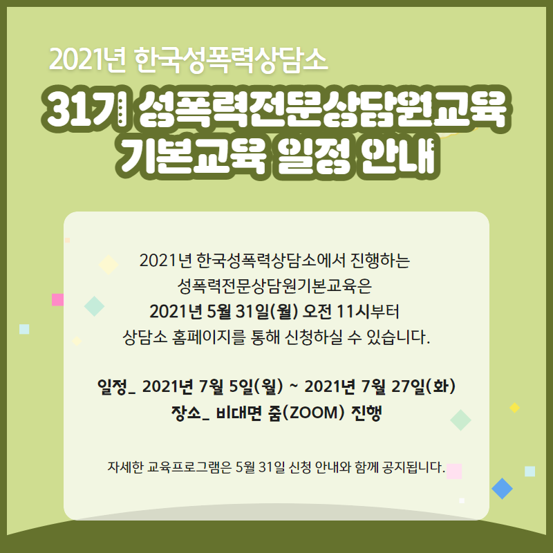 [한국성폭력상담소] 31기 성폭력전문상담원기본교육 신청 안내 (5/31~)
