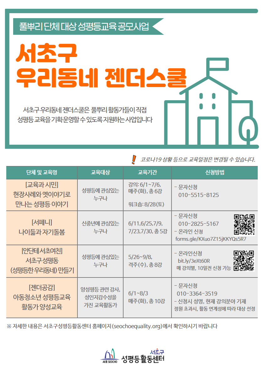 서초구성평등활동센터의 ‘2021년 풀뿌리활동가 지원사업 서초구 우리동네 젠더스쿨’에 선정된 4개 단체의 프로그램이 시작됩니다.