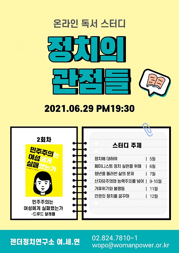 여세연은 온라인 독서 스터디 <정치의 관점들>을 통해 페미니즘, 청년, 신자유주의와 능력주의, 인권, 기후 위기 등의 키워드를 중심으로 정치를 사유해 보고자 합니다.