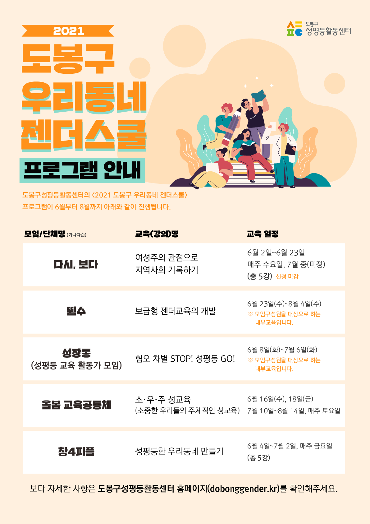 도봉구성평등활동센터의 <2021 도봉구 우리동네 젠더스쿨프로그램이 6월부터 8월까지 아래와 같이 진행됩니다.