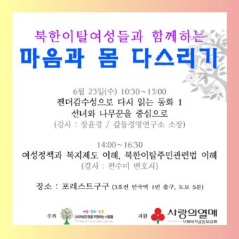 여인지사는 사랑의열매 사회복지공동모금회 북한이탈주민지원사업에 선정되어 < 북한이탈여성들을 위한 나의 마음과 몸 다스리기 > 사업을 진행합니다.