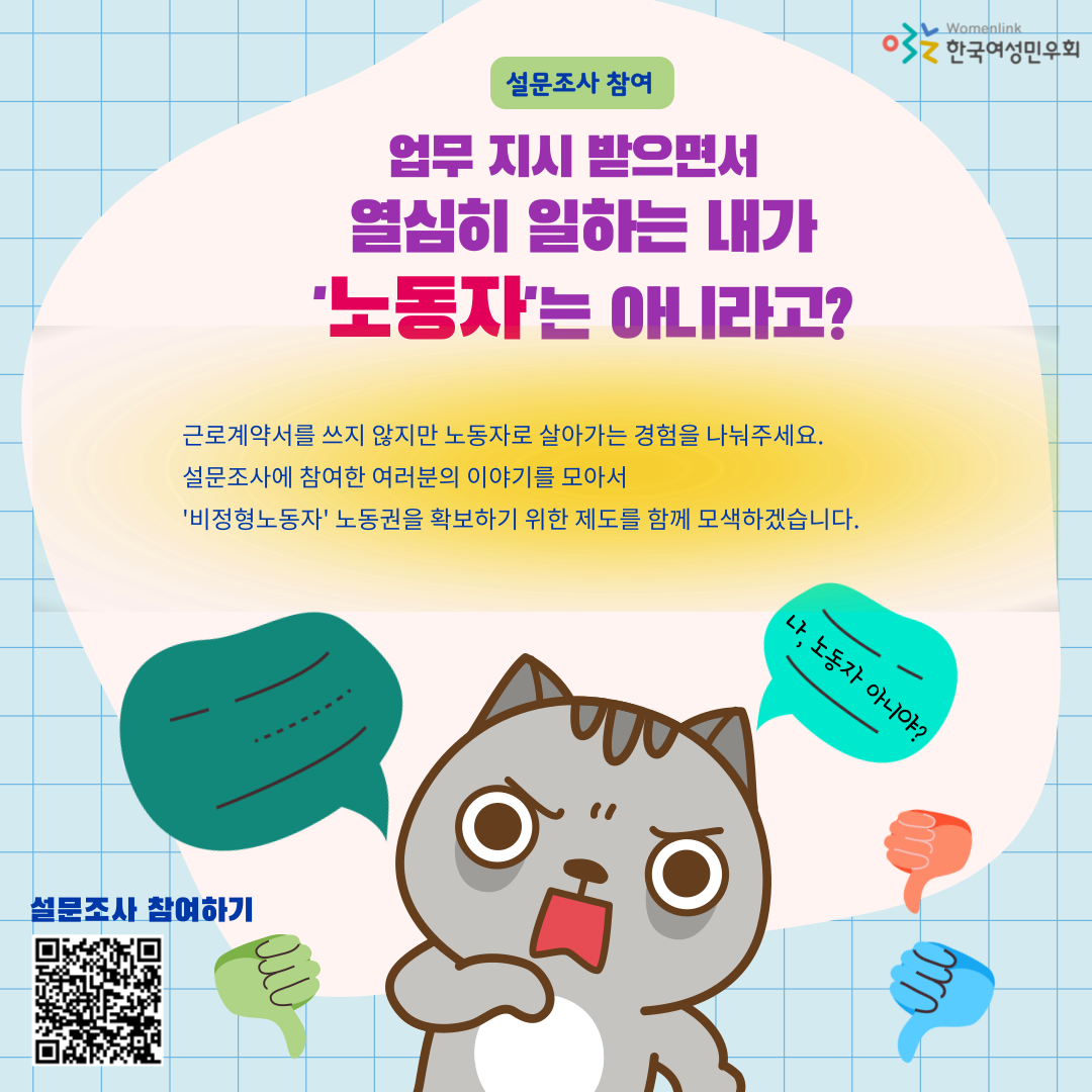 일하는 사람들 모두의 권리를 확보하기 위해서, 당신의 경험을 들려주세요. 고용형태가 점차 다양해지는 최근의 급격한 노동환경을 반영하지 못하는 현행 법과 제도를 바꾸기 위한 설문에 함께 해 주세요.