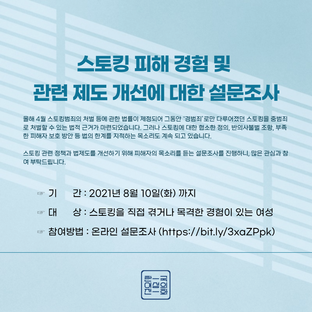 이에 스토킹 처벌법의 의미와 문제를 짚고, 실효성 있는 피해자 지원제도의 마련 방향을 논의하기 위한 토론회 <스토킹, 당사자의 목소리로 ‘정책’을 말하다>(가)를 8월말 개최할 예정입니다. 여성폭력 근절을 위해 함께 하고자 하는 분들의 많은 관심과 참여바랍니다.