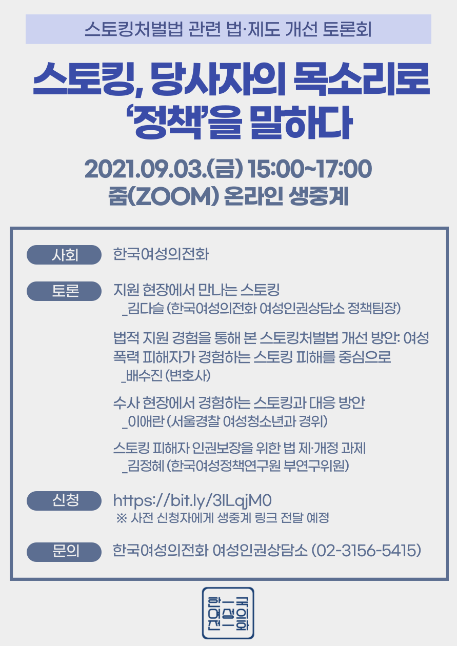 이에 한국여성의전화에서 피해자, 지원기관 등 현장의 목소리를 통해 스토킹 피해가 발생하는 양상, 현행 법제도의 한계 등을 알아보고, 스토킹 피해자 인권보장을 위한 법제도 개선 및 정책 마련을 위해 토론회를 진행하고자 합니다. 많은 관심과 참여 바랍니다.