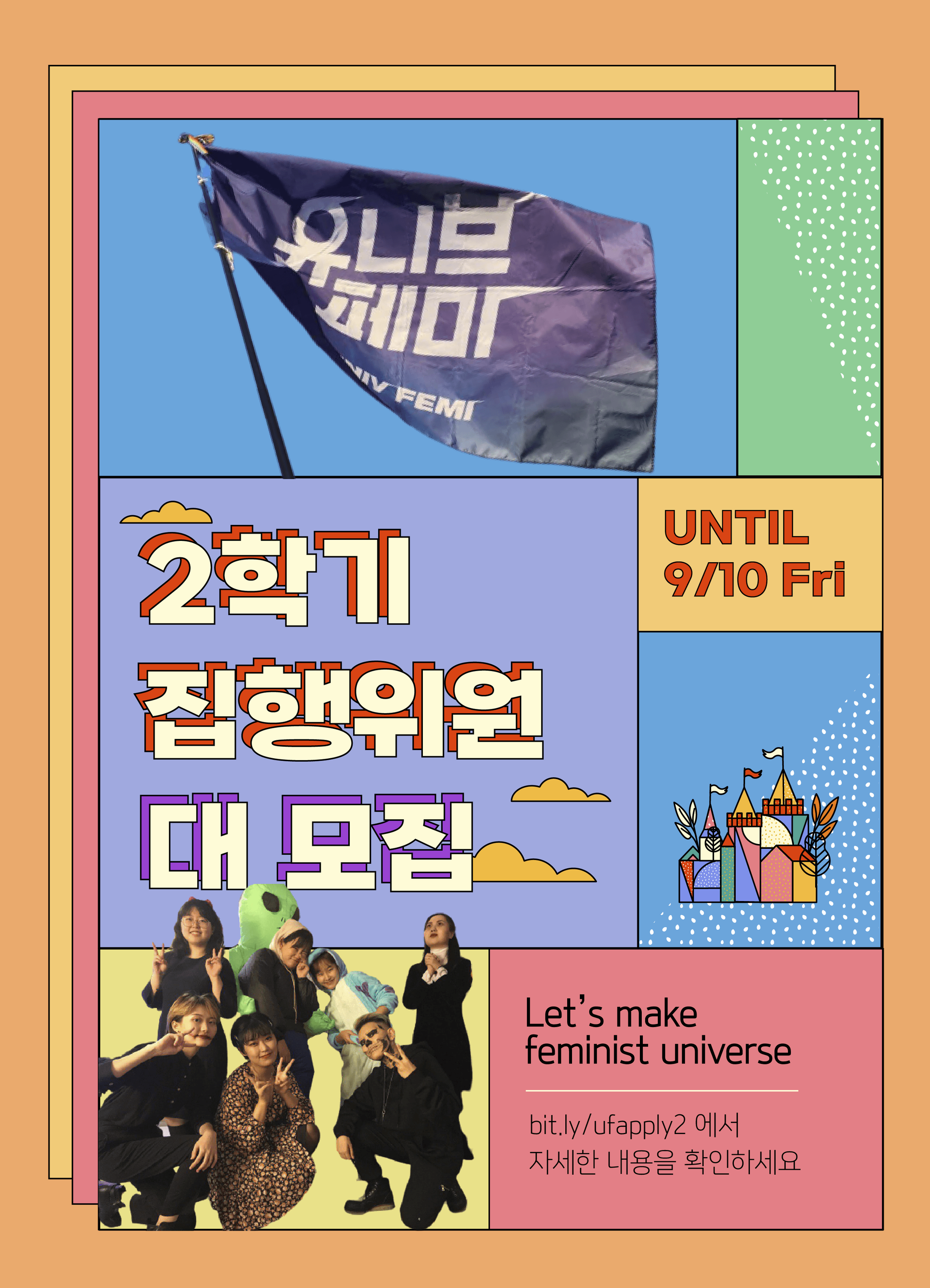 [사진설명] 세로가 더 긴 사각형 포스터 이미지. 주황색 배경 위에 같은 비율의 사각형이 종이처럼 세 장 겹쳐져 있다. 맨 위에 놓인 사각형 도형 안에는 칸이 나뉘어져 있어, 각각 파란색, 초록색, 보라색, 노란색, 분홍색으로 알록달록 칠해져 있다. 최상단의 파란색 칸에는 유니브페미 깃발이 흩날리고 있고, 그 아래 보라색 칸에는 밝은 노란색 글씨로 “2학기 집행위원 대 모집”이라고 적혀 있다. 우측의 납작한 노란색 칸에는 빨간색 글씨로 “UNTIL 9/10 Fri”라는 모집 기한이 쓰여 있고 그 아래 파란색 칸에는 칠교놀이로 만든 것 같은 성 그림이 있다. 최하단 좌측에는 유니브페미 집행위원들이 할로윈 코스튬을 입고 찍은 사진이 삽입되어 있고, 그 우측에는 검은색 글씨로 “Let’s make feminist universe / bit.ly/ufapply2 에서 자세한 내용을 확인하세요”라고 적힌 분홍색 칸이 있다. [설명 끝]