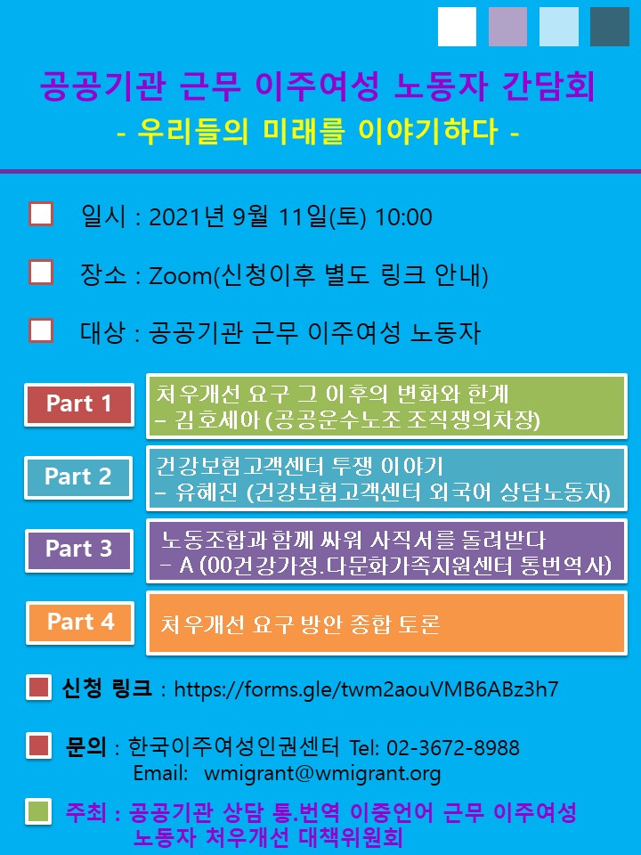 2020년에는 공공기관 근무 이주여성 노동자 임금차별 고발 및 처우개선 요구를 위한 설문조사, 기자회견, 토론회를 진행했습니다. 2021년 상반기에는 ‘이주여성노동자를 위한 노동인권을 위한 교육”을 실시했습니다.