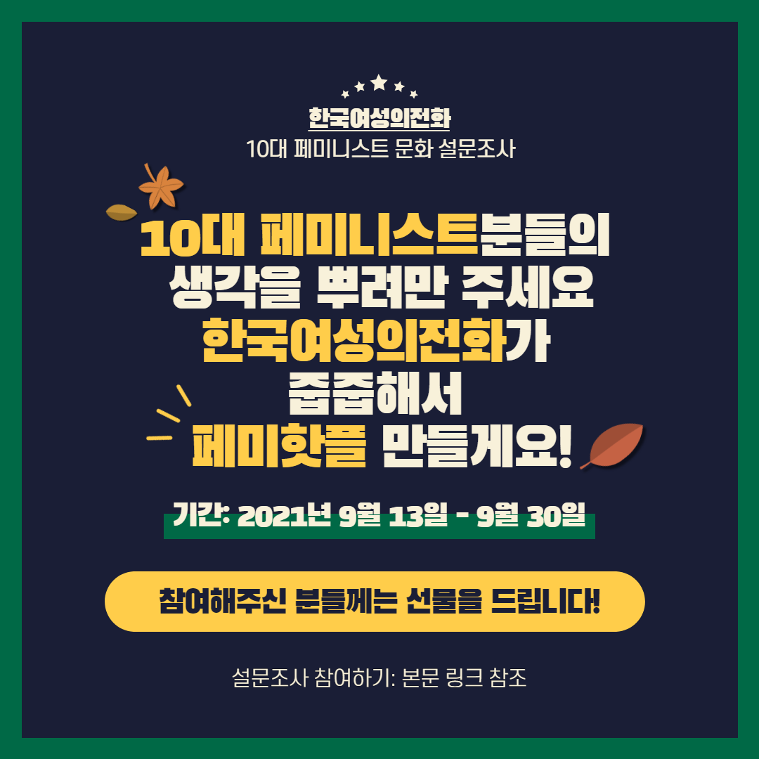 [한국여성의전화] 10대 페미니스트분들의 생각을 뿌려만 주세요! 한국여성의전화가 줍줍해서 페미핫플 만들게요;) (~9/30)