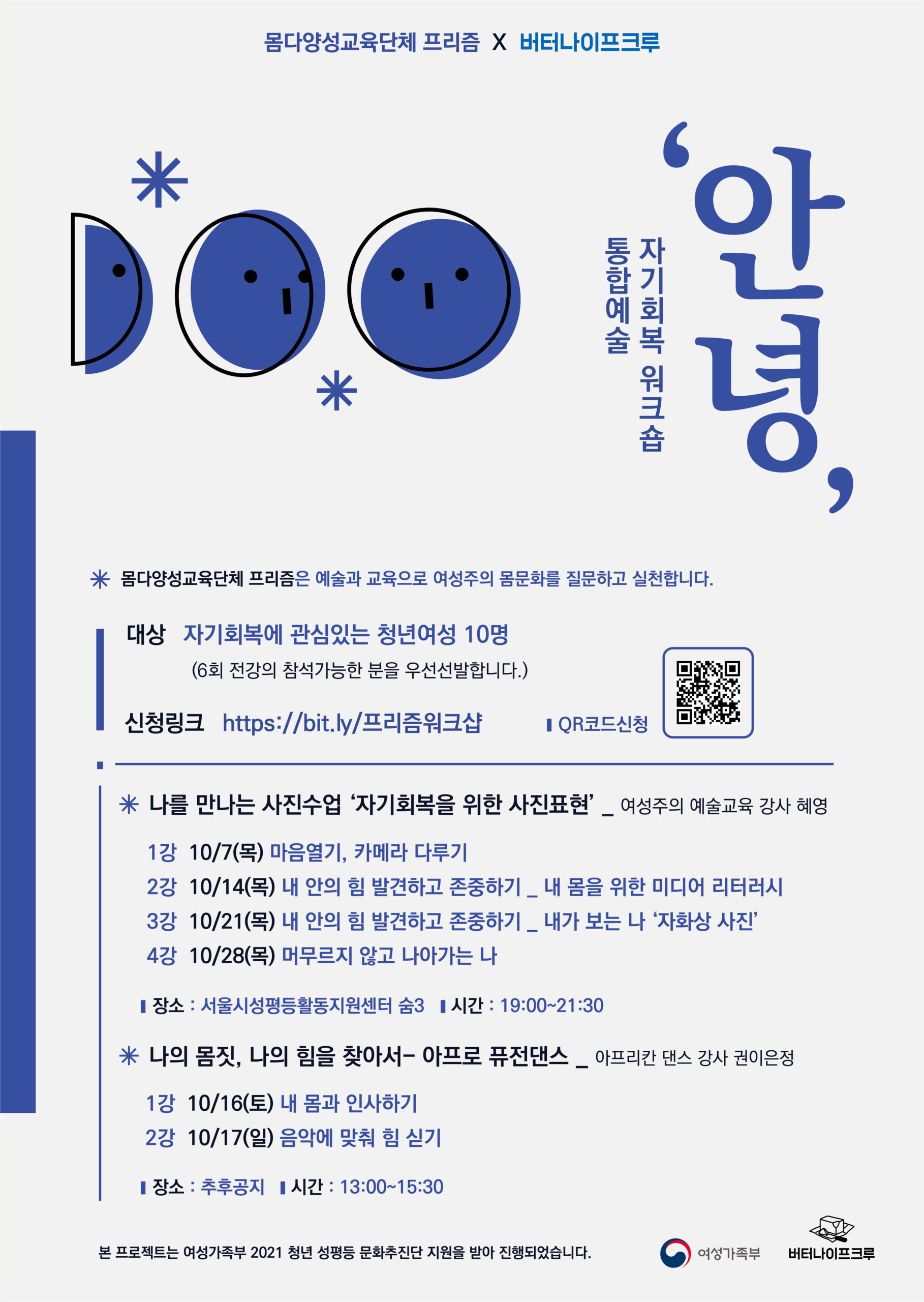 몸다양성교육단체 프리즘은 버터나이프크루의 지원을 받아 통합예술 자기회복워크숍 ‘안녕’을 진행합니다.