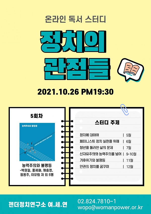 [젠더정치연구소 여.세.연] 온라인 독서 스터디 <정치의 관점들> 5회차 – 능력주의와 불평등 (10/26)