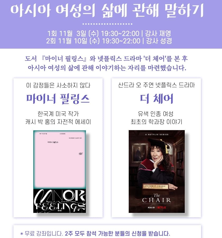 캐시 박 홍 작가의 책 <마이너 필링스> 산드라 오 주연의 넷플릭스 드라마 <더 체어>를 보면서 아시아 여성의 삶에 관해, 여성과 인종의 교차성에 관해 대화하는 자리를 마련하였습니다.