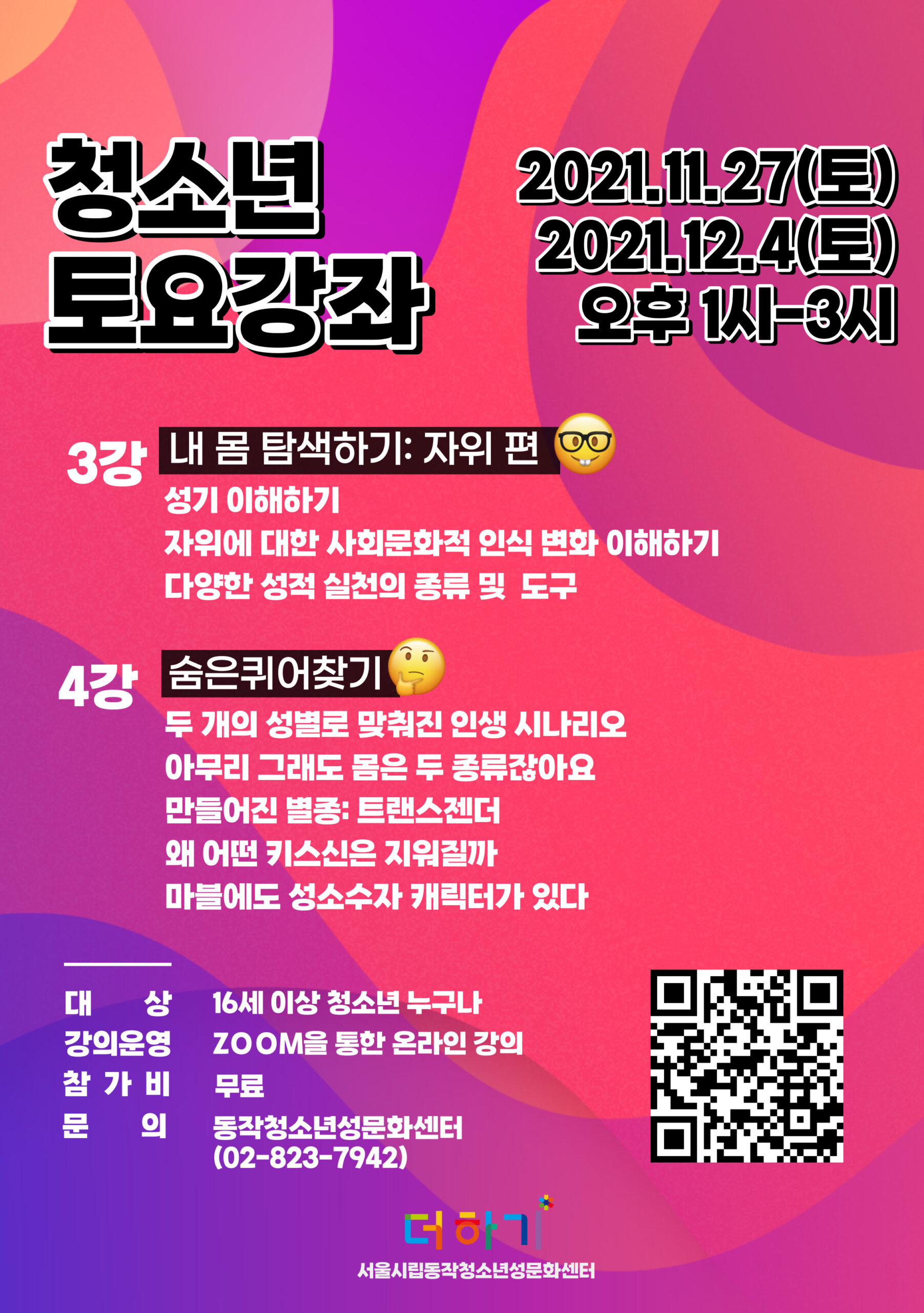 [동작청소년성문화센터 더하기] <청소년 토요강좌 3, 4강> 참가자 모집 (11/27, 12/4)