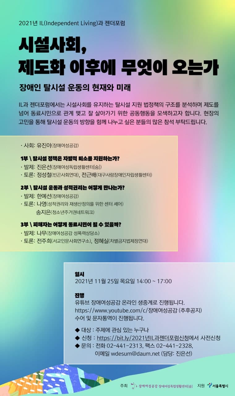 [장애여성공감] 2021년 IL과 젠더포럼 <시설사회, 제도화 이후에 무엇이 오는가 : 장애인 탈시설 운동의 현재와 미래> (11/25)